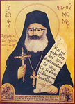 Ο Φιλούμενος έμεινε στην αγία γη για 46 έτη διακονώντας την εκεί αδελφότητα του Πατριαρχείου, ως φύλακας αγίων τόπων, αλλά εξαιρέτως αγίων τρόπων. Τελευταίος σταθμός της διακονίας του ήταν το Φρέαρ του Ιακώβ, το οποίον έγινε τόπος του μαρτυρίου του. Στις 16 Νοεμβρίου 1979 μ.Χ. (29 Νοεμβρίου με το νέο ημερολόγιο), φανατικοί σιωνιστές, που διεκδικούσαν το προσκύνημα ως δικό τους, τον κατέκοψαν την ώρα του εσπερινού, Αγιοταφίτες πατέρες παρέλαβαν το τίμιο του λείψανο έπειτα από πέντε ημέρες και το ενταφίασαν στην αγία γη.