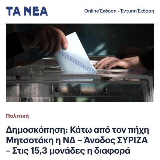 Η ΝΔ δημοσκοπικά στην εκτίμηση ψήφου και σε όλες σχεδόν τις μετρήσεις, είναι πάνω απ´το ποσοστό αυτό έστω και οριακά, ο Σύριζα ειναι 7 μονάδες κάτω απ´τις ευρωεκλογές του ‘19, αλλά ιδού πώς παρουσιάζουν την είδηση τα ΝΕΑ του ΔΟΜ.