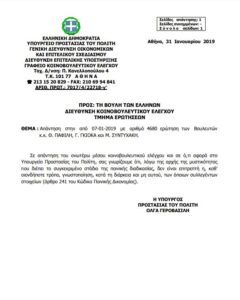 Αναλυτικότερα, η απάντηση της τότε Υπουργού ήταν η εξής: ” Σε απάντηση του ανωτέρω μέσου κοινοβουλευτικού ελέγχου και σε ό,τι αφορά στο Υπουργείο Προστασίας του Πολίτη, σας γνωρίζουμε ότι, λόγω της αρχής της μυστικότητας που διέπει το συγκεκριμένο στάδιο της ποινικής διαδικασίας, δεν είναι επιτρεπτή η, καθ’ οιονδήποτε τρόπο, γνωστοποίηση, κατά τη διάρκεια και μη αυτού, των όποιων συλλεγέντων στοιχείων (άρθρο 241 του Κώδικα Ποινικής Δικονομίας)”.