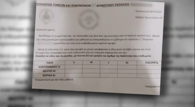 Την περασμένη εβδομάδα όλοι οι γονείς του συγκεκριμένου δημοτικού σχολείου έλαβαν αυτό το χαρτί, το οποίο πρέπει να συμπληρώσουν και να υπογράψουν εάν φυσικά συμφωνούν με την απόκτηση σχολικής στολής.