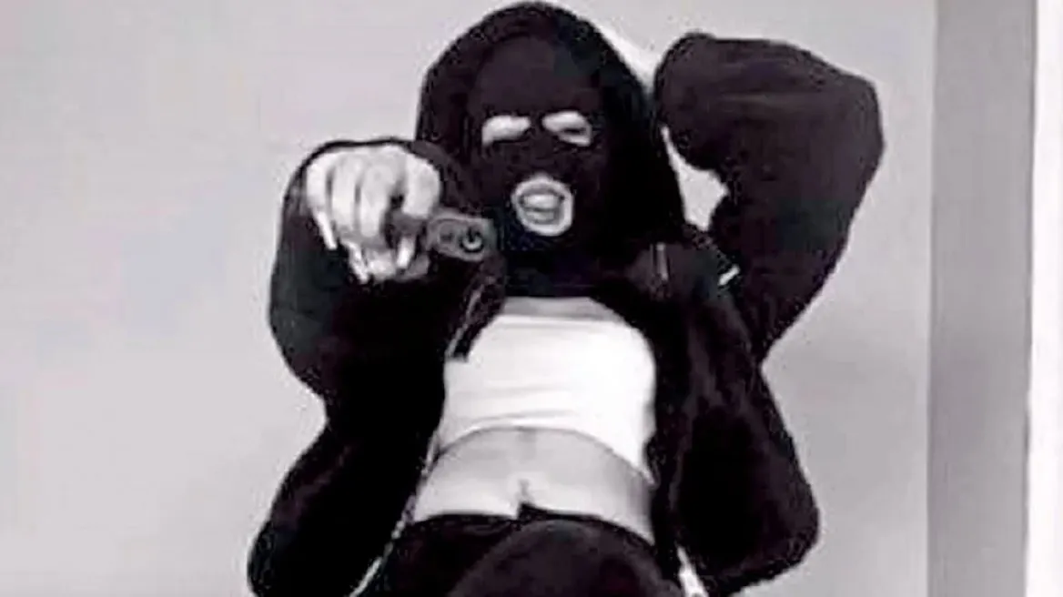 Στο ίδιο καρέ που φέρεται να έχει τραβηχτεί σε σχολική αίθουσα, η κοπέλα φοράει μια κουκούλα full face, σαν αυτές που χρησιμοποιούν εγκληματίες, και βγάζει τη γλώσσα θεωρώντας ότι όλο αυτό πρόκειται για αστείο.