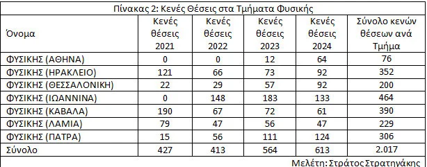Μια σύντομη απόδειξη βλέπουμε στον πίνακα 2. Οι κενές θέσεις στα Τμήματα Φυσικής αυξάνουν κάθε χρόνο. Πρωταθλητής το Τμήμα των Ιωαννίνων με 464 κενές θέσεις στην τετραετία. Στα 4 χρόνια εφαρμογής της ΕΒΕ οι κενές θέσεις στα Τμήματα Φυσικής αυξήθηκαν κατά 50%. Σε οποιαδήποτε άλλη χώρα θα προσπαθούσαν να καλύψουν τις κενές θέσεις, μειώνοντας το συντελεστή της ΕΒΕ ή απαιτώντας την κατάργησή της ΕΒΕ.