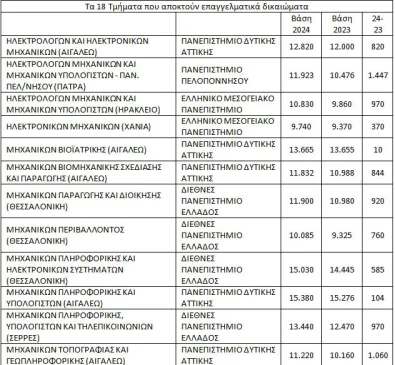 Ευχάριστη έκπληξη αποτέλεσε η αύξηση της ζήτησης για τα 18 Τμήματα Μηχανικών, που γίνονται πια κανονικά Τμήματα Μηχανικών. Οι απόφοιτοί τους θα έχουν τα ίδια επαγγελματικά δικαιώματα με τους αποφοίτους των άλλων Τμημάτων Μηχανικών των Πολυτεχνικών Σχολών. Η απόδοση των επαγγελματικών δικαιωμάτων, με καθυστέρηση 5! ετών, εκτόξευσε τη ζήτηση, μαζί και τη βάση των Τμημάτων. Είχαμε άνοδο μέχρι και 1599 μόρια στο Τμήμα Μηχανολόγων Μηχανικών στο Ηράκλειο, σε μια χρονιά που οι βάσεις στις σχολές του 2ου Πεδίου σημείωσαν μεγάλη πτώση, λόγω της δυσκολίας των θεμάτων στη Φυσική και τα Μαθηματικά. Παρόλα αυτά οι βάσεις σ’ αυτά τα Τμήματα εκτοξεύτηκαν.