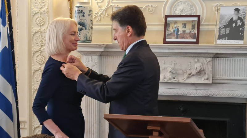 Ο Χρυσός Σταυρός του Τάγματος της Ευποιίας της ελληνικής πολιτείας απονεμήθηκε το μεσημέρι της Πέμπτης στη διάσημη Βρετανίδα ιστορικό Μπέτανι Χιουζ και στη διακεκριμένη Βρετανίδα δημοσιογράφο Σάρα Μπάξτερ, σε τελετή στην επίσημη κατοικία του πρέσβη της Ελλάδας στο Λονδίνο.