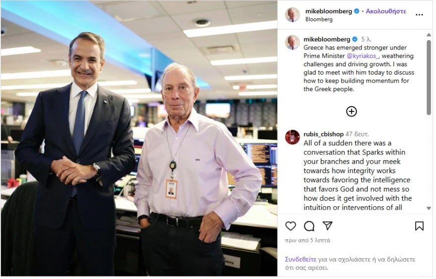 Εύσημα από τον μεγιστάνα Μάικλ Μπλούμπεργκ για τη χώρα μας: Η Ελλάδα έγινε πιο ισχυρή υπό την ηγεσία του Κυριάκου Μητσοτάκη