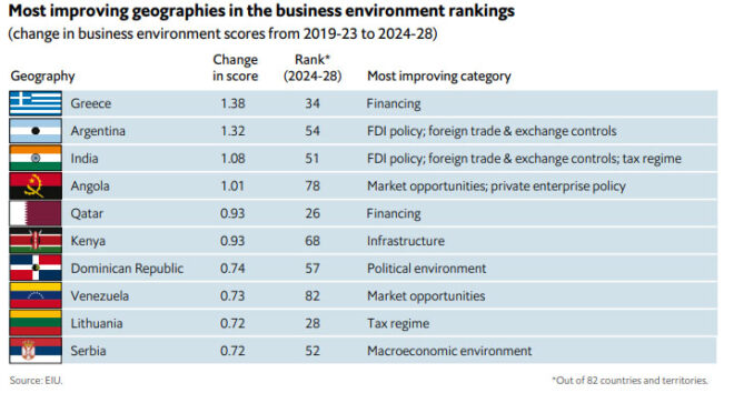 Τη μεγαλύτερη βελτίωση του επιχειρηματικού περιβάλλοντος ανάμεσα σε 82 χώρες παρουσιάζει η Ελλάδα την πενταετία 2024-2028 έναντι της περασμένης περιόδου 2019-2023, σύμφωνα με τον Economist.