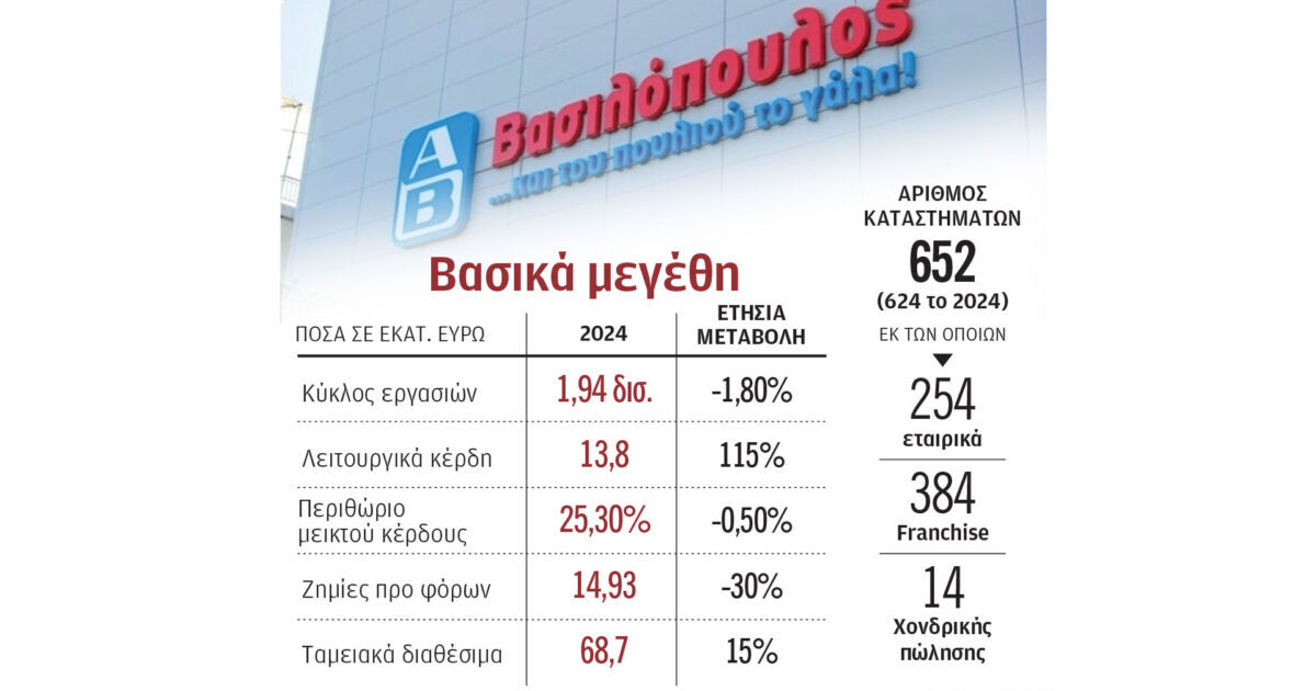Ζημιογόνος ήταν η χρήση του 2024 για την «ΑΒ Βασιλόπουλος», με το καθαρό αποτέλεσμα να είναι ζημίες για τρίτη συνεχή χρονιά, ενώ η αλυσίδα σούπερ μάρκετ, η Νο 3 της εγχώριας αγοράς, κατέγραψε πέρυσι και μείωση του τζίρου, απομακρυνόμενη ακόμη περισσότερο από τα 2 δισ. ευρώ. Πάντως, ο επικεφαλής της αλυσίδας στην Ελλάδα, Νίκος Λαβίδας, εμφανίστηκε χθες σε συνέντευξη Τύπου αισιόδοξος για επιστροφή στην κερδοφορία –σε επίπεδο καθαρών αποτελεσμάτων– το 2026, ενώ απέδωσε τη μείωση του τζίρου στο κλείσιμο οκτώ καταστημάτων μες στο 2024, καθώς και στη μετατροπή σημαντικού αριθμού εταιρικών καταστημάτων σε σημεία που λειτουργούν πλέον με το σύστημα franchising. Ο ίδιος δεν παρέλειψε να αφήσει σαφείς αιχμές για τη ρητορική –ρητορική επίθεσης στα σούπερ μάρκετ για τα κέρδη τους– η οποία χρησιμοποιείται από τον υπουργό Ανάπτυξης τις τελευταίες εβδομάδες, επισημαίνοντας ότι το 2024 υποχώρησε περαιτέρω κατά μισή ποσοστιαία μονάδα το περιθώριο μεικτού κέρδους της «ΑΒ Βασιλόπουλος», κάτι που μεταφράζεται σε απώλεια 10 εκατ. ευρώ από τα κέρδη. «Χάνουμε 10 εκατ. ευρώ για να είμαστε σύννομοι. Υπάρχουν χιλιάδες κωδικοί και μπορεί να σου ξεφύγει ένας, με συνέπεια μικρά πρόστιμα να επιβάλλονται σε όλες τις αλυσίδες. Μας προκαλεί το μεγαλύτερο πρόβλημα στην καθαρή κερδοφορία μας», υποστήριξε ο κ. Λαβίδας. Ειδικότερα, το 2024 ο κύκλος εργασιών της «ΑΒ Βασιλόπουλος» διαμορφώθηκε σε 1,94 δισ. ευρώ έναντι 1,97 δισ. ευρώ το 2023, καταγράφοντας μείωση 1,8%.