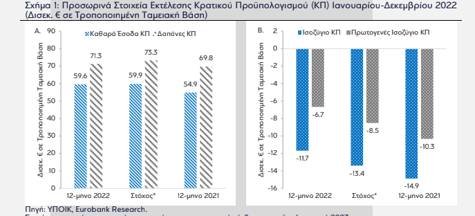 Πιο συγκεκριμένα από έλλειμμα 8,45 δισ. ευρώ το 2021, το πρωτογενές ισοζύγιο γενικής κυβέρνησης μετατράπηκε το 2022 σε πλεόνασμα 273 εκατ. ευρώ. Πέρασε δηλαδή από -4,7% του Α.Ε.Π. σε 0,1%. Στο ίδιο διάστημα, το Α.Ε.Π. αυξήθηκε κατά 26 δισ. ευρώ (από τα 181,675 δισ. ευρώ στα 208,030 δισ. ευρώ). Το χρέος γενικής κυβέρνησης, έκανε βουτιά 23 ποσοστιαίων μονάδων, καθώς έκλεισε στο 171,3% του Α.Ε.Π. από 194,6%.