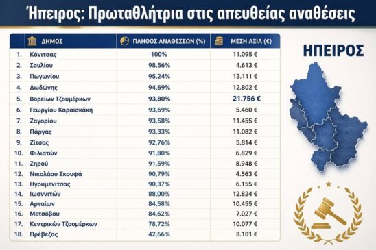 Βάση λοιπόν των ποσοστών πρώτος έρχεται ο Δήμος Κόνιτσας με 100% που σημαίνει ότι όλες οι αναθέσεις σε αυτόν τον Δήμο είναι απ’ ευθείας και για τον Δήμο της Πρέβεζας με ποσοστό 42.66% σημαίνει ότι στην Πρέβεζα μια στις δύο αναθέσεις είναι απ’ ευθείας.