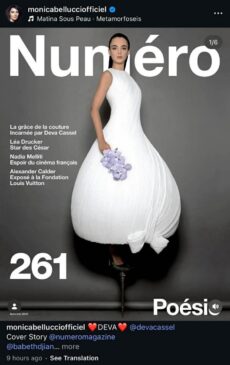 Η 61χρονη ηθοποιός δημοσίευσε στο προφίλ της στιγμιότυπα από την τελευταία επαγγελματική φωτογράφηση της μεγάλης κόρης που έχει αποκτήσει με τον Βενσάν Κασέλ, Ντέβα Κασέλ, για το περιοδικό Numero και επέλεξε να τα συνοδεύσει με το τραγούδι «Μεταμορφώσεις» που ερμήνευσε ο αείμνηστος Έλληνας τραγουδιστής και ηθοποιός.