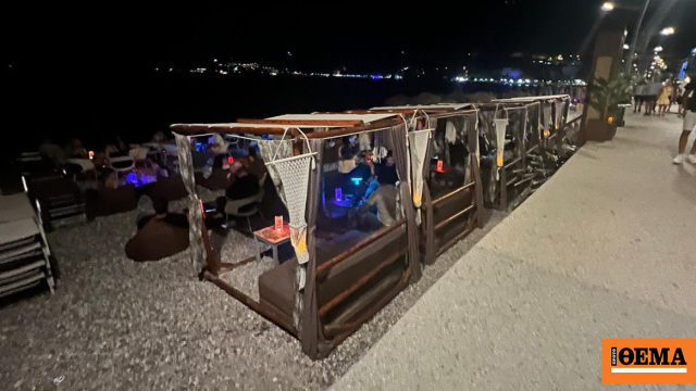 Ολόκληρα κιόσκια με υφασμάτινες κουρτίνες, πουφ, καναπέδες και φωτιστικά LED έχουν τοποθετηθεί κυριολεκτικά πάνω στο βότσαλο, σε απόσταση αναπνοής από το κύμα. Η ατμόσφαιρα θυμίζει περισσότερο σκηνικό από… resort στο Ντουμπάι, παρά δημόσια ακτή σε ελληνική πόλη, με το ύφος να κυριαρχείται από προκάτ αισθητική και ναργιλέδες που φωσφορίζουν σε όλα τα χρώματα.