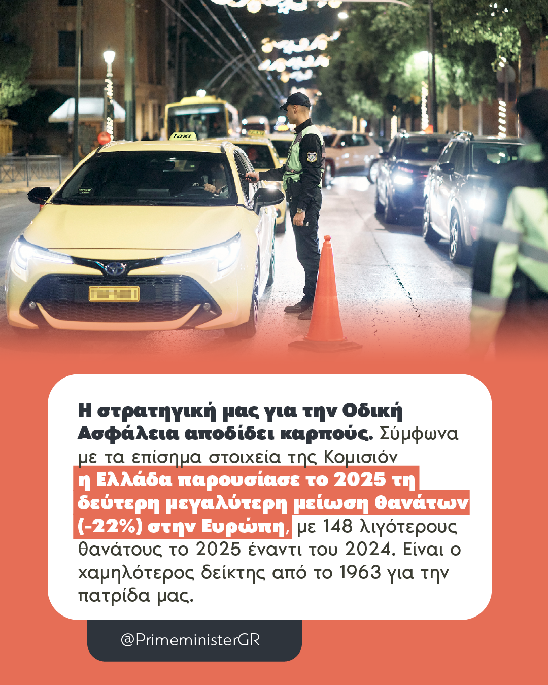 Μιας και είμαι στο πεδίο των μεταφορών, με χαρά διαπιστώνουμε ότι η στρατηγική μας για την Οδική Ασφάλεια έχει αρχίσει να αποδίδει καρπούς. Σύμφωνα με τα επίσημα στοιχεία της Κομισιόν που δημοσιεύτηκαν την Τρίτη, η Ελλάδα το 2025 κατέγραψε τη δεύτερη μεγαλύτερη μείωση θανάτων, 148 λιγότεροι σε σχέση με το 2024. Πρόκειται για τον χαμηλότερο αριθμό που έχει καταγραφεί στη χώρα μας από το 1963. Η μείωση αυτή είναι αποτέλεσμα πολλών και διαφορετικών παρεμβάσεων, όπως οι εντατικοί και στοχευμένοι έλεγχοι, τα αλκοτέστ από την Ελληνική Αστυνομία, η αξιοποίηση της τεχνολογίας, η 24ωρη λειτουργία των Μέσων Μαζικής Μεταφοράς κάθε Σάββατο βράδυ αλλά και η αναβάθμιση των υποδομών, μαζί με τη δημιουργία νέων ασφαλέστερων δρόμων, όπως για παράδειγμα ο αυτοκινητόδρομος Πάτρα-Πύργος. Ταυτόχρονα, προχωρούν σημαντικά έργα: σύντομα παραδίδεται ο Ε65, ενώ στον ΒΟΑΚ υλοποιούνται ήδη παρεμβάσεις οδικής ασφάλειας σε επικίνδυνα σημεία. Τα στοιχεία είναι ενθαρρυντικά, αλλά δεν αφήνουν περιθώρια εφησυχασμού. Ο αριθμός των θυμάτων παραμένει υψηλός. Η οδική ασφάλεια είναι εθνική προτεραιότητα. Συνεχίζουμε με στόχο τη δραστική μείωση των τροχαίων, σε ευθυγράμμιση και με τον ευρωπαϊκό στόχο για μείωση κατά 50% έως το 2030.