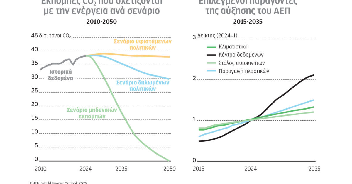 Παρά την ανάπτυξη των ανανεώσιμων, η κατανάλωση πετρελαίου, φυσικού αερίου και άνθρακα συνεχίζει να αυξάνεται. Βάσει του σεναρίου υφιστάμενων πολιτικών (CPS), οι εκπομπές CO2 που σχετίζονται με την παραγωγή και κατανάλωση ενέργειας παραμένουν σε υψηλά επίπεδα έως το 2050, μακριά από τον στόχο περιορισμού της αύξησης της παγκόσμιας θερμοκρασίας στον 1,5 °C. Αντιστοίχως, και στο σενάριο δηλωμένων πολιτικών (STEPS) η μείωσή τους είναι περιορισμένη. Oσον αφορά τους παράγοντες που συνδέονται με την ανάπτυξη του παγκόσμιου ΑΕΠ (2015-2035), τα κέντρα δεδομένων εμφανίζουν τη μεγαλύτερη αύξηση, ακολουθούμενα από τα συστήματα κλιματισμού, τη βιομηχανία πλαστικών και την ανανέωση του στόλου οχημάτων.