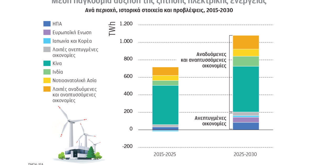 Βρισκόμαστε επίσημα στην «εποχή του ηλεκτρισμού», με τη ζήτηση να αυξάνεται ραγδαία. Για την περίοδο 2025-2030, ο παγκόσμιος ετήσιος ρυθμός αύξησης της ζήτησης ηλεκτρισμού αναμένεται να φτάσει στο 3,6%, έναντι 2,8% της προηγούμενης δεκαετίας (ετήσια προσθήκη 1.100TWh, από 700TWh την περίοδο 2015-2025). Η βιομηχανία, η ηλεκτροκίνηση, ο κλιματισμός, η τεχνητή νοημοσύνη και τα κέντρα δεδομένων ηγούνται της ανόδου. Οι αναδυόμενες οικονομίες αποτελούν την κινητήριο δύναμη καλύπτοντας το 80% της νέας ζήτησης, με την Κίνα να πρωταγωνιστεί συνεισφέροντας σχεδόν το 50%. Απαιτούνται άμεσα επενδύσεις και πολιτικές ενίσχυσης των διεθνών δικτύων για την επαρκή κάλυψη των νέων αναγκών.