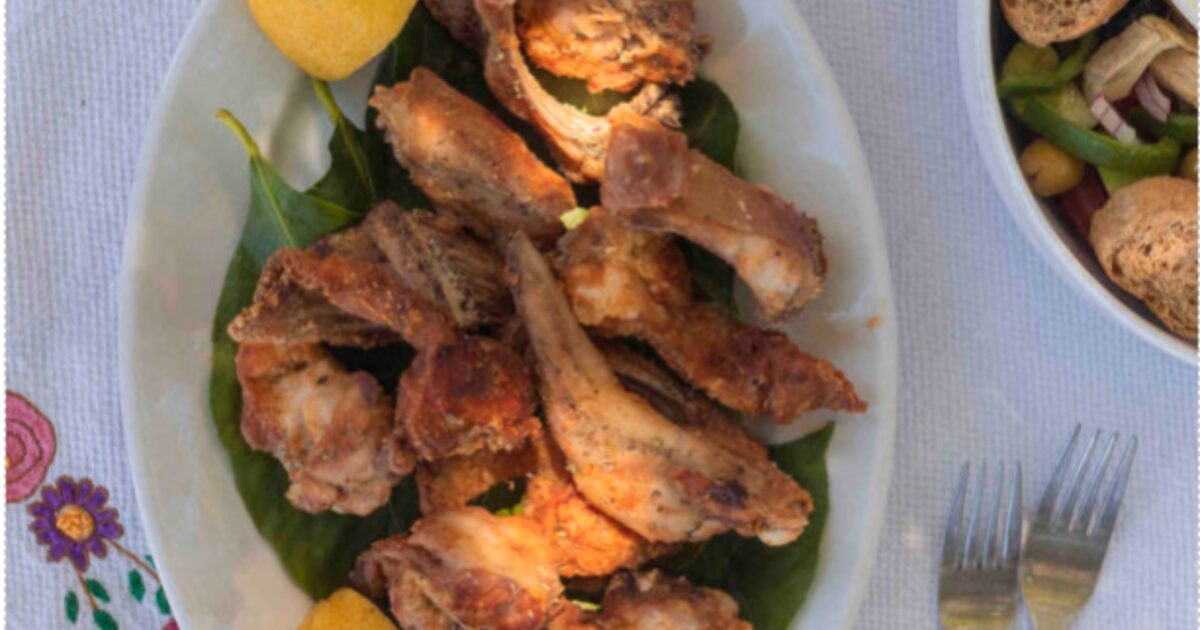 Τον συναντήσαμε στην κουζίνα της ταβέρνας, πάνω από το τηγάνι όπου ζέσταινε το λάδι. Είχε κόψει ο ίδιος το κρέας σε λεπτές φέτες σαν παϊδάκια – βασικό στάδιο της συνταγής, καθώς τα κομμάτια πρέπει να έχουν ομοιόμορφο πάχος για να τηγανιστούν όλα στον ίδιο χρόνο. Η κοπή δεν είναι εύκολη υπόθεση και ο χασάπης θα πρέπει να είναι έμπειρος, ώστε να μη λιανίσει τα λεπτά κόκαλα του ζώου, γιατί το τρίμμα τους θα χωθεί στο ψαχνό. Ο Νεκτάριος τα είχε κόψει με χειρουργική ακρίβεια και τέχνη, σε κομμάτια όχι μεγαλύτερα από οκτώ, το πολύ 10 πόντους. Τα παϊδάκια αλευρώνονται, μπαίνουν στο τηγάνι με το καυτό λάδι και, αμέσως μόλις βγουν, τους ρίχνουν λίγη ξερή ρίγανη και χυμό λεμονιού. «Το κουνέλι θέλει δυνατό τηγάνισμα», συμβουλεύει ο Νεκτάριος, που έχει ανάψει την γκαζιέρα και περιμένει να ζεσταθεί το λάδι. «Τα κομμάτια όμως τα ρίχνεις στο λάδι προτού κάψει καλά και, μόλις τα βάλεις, τότε φουλάρεις τη φωτιά. Παλιά η φωτιά ήταν από λιανά κλαριά ελιάς και το κουνέλι έβγαινε πιο νόστιμο, πιο τραγανιστό», συμπληρώνει. Το λάδι είναι συνήθως ελαιόλαδο, αλλά ελαφρύ. Συχνά το τηγανίζουν και σε σπορέλαιο γιατί ροδίζει καλύτερα τα κομμάτια. «Το ελαιόλαδο είναι καλύτερα να το τρως ωμό», λένε εδώ.