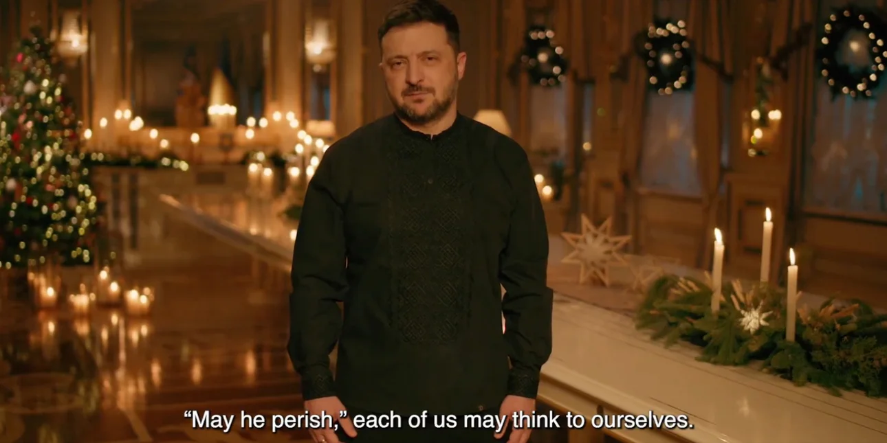 «Αγαπητέ λαέ, Από τα αρχαία χρόνια, οι Ουκρανοί πίστευαν ότι τη νύχτα των Χριστουγέννων, οι ουρανοί ανοίγουν. Και αν τους πεις το όνειρό σου, τότε σίγουρα θα γίνει πραγματικότητα. Σήμερα όλοι έχουμε το ίδιο όνειρο. Και κάνουμε μια ευχή, για όλους μας. «Μακάρι να πεθάνει», ίσως ο καθένας από εμάς να πει από μέσα του. Αλλά όταν στραφούμε στον Θεό, φυσικά, ζητάμε περισσότερα. Ζητάμε ειρήνη. Για την Ουκρανία. Αγωνιζόμαστε γι’ αυτήν. Και προσευχόμαστε γι’ αυτήν», είπε ο Ζελένσκι κι ύστερα συνέχισε στο χριστουγεννιάτικο πνεύμα.