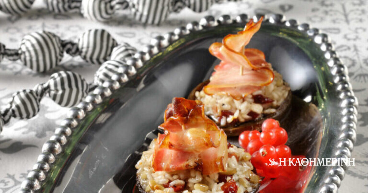 Φτιάχνουμε ένα μυρωδάτο ρύζι με κουκουνάρι, σταφίδες και μπαχαρικά, το ενισχύουμε με μανιτάρια και μπέικον και αντί να γεμίσουμε τη γαλοπούλα γεμίζουμε μεγάλα μανιτάρια – έτσι έχουμε ένα ιδιαίτερο ορεκτικό για το γιορτινό τραπέζι.