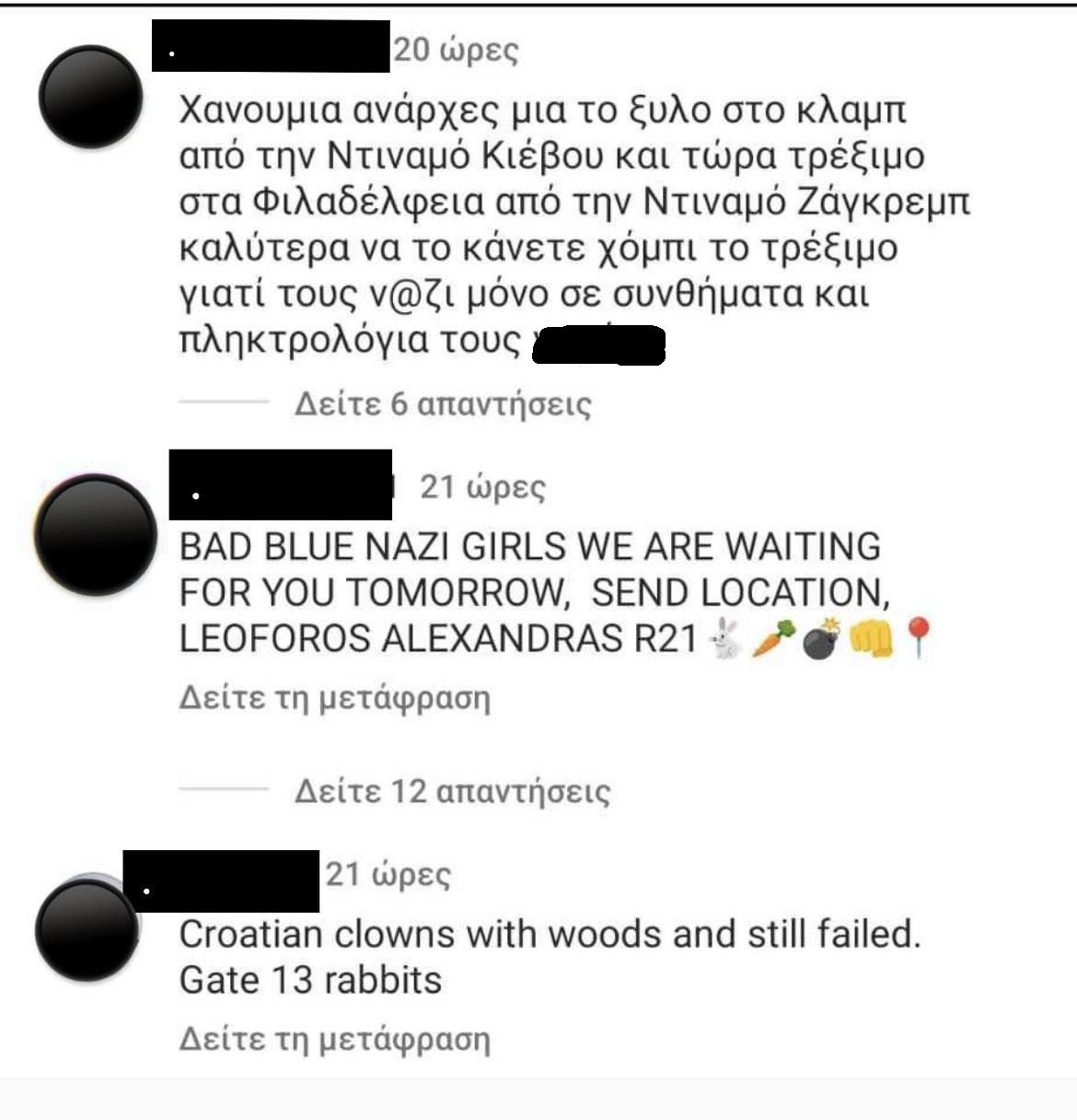 Είναι δε ανατριχιαστικά τα σχόλια ανεγκέφαλων, που αρχικά εικάζουν ότι το θύμα που δέχθηκε τις μαχαιριές, είναι Κροάτης -όπως αναπαράχθηκε αρχικά, αλλά ύστερα ταυτοποιήθηκε το πρόσωπο του 29χρονου Μιχάλη. «Μαζέψτε τον Κροάτη από τον αετό. Μαζέψτε τα αδέλφια σας άλλη φορά και μετά αρχίστε να κάνετε ότι ξέρετε», γράφει ο χρήστης του διαδικτύου, συνοδεύοντας το μήνυμά του με δύο εικονίδια που απεικονίζουν λαγούς, ήτοι, τους… ηττημένους, στη γλώσσα των χούλιγκαν.