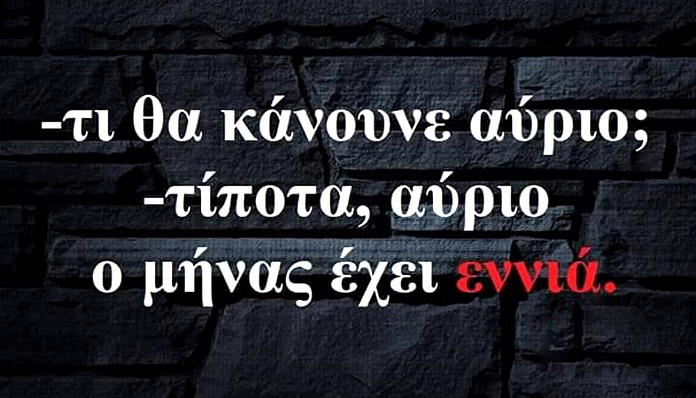 …αναφέρεται στη φράση “ο μήνας έχει εννιά”, η οποία χρησιμοποιείται για να δηλώσει μια άνετη ζωή, έλλειψη άγχους, χαλαρή στάση απέναντι στα προβλήματα, ή γενικά ότι κάποιος είναι βολεμένος. Η επικρατέστερη εκδοχή για την ερμηνεία της φράσης προέρχεται από τα πρώτα χρόνια της δημιουργίας του ελληνικού κράτους, καθώς οι δημόσιοι υπάλληλοι πληρώνονταν κάθε εννιά του μήνα, επομένως ήταν μέρα χαράς.