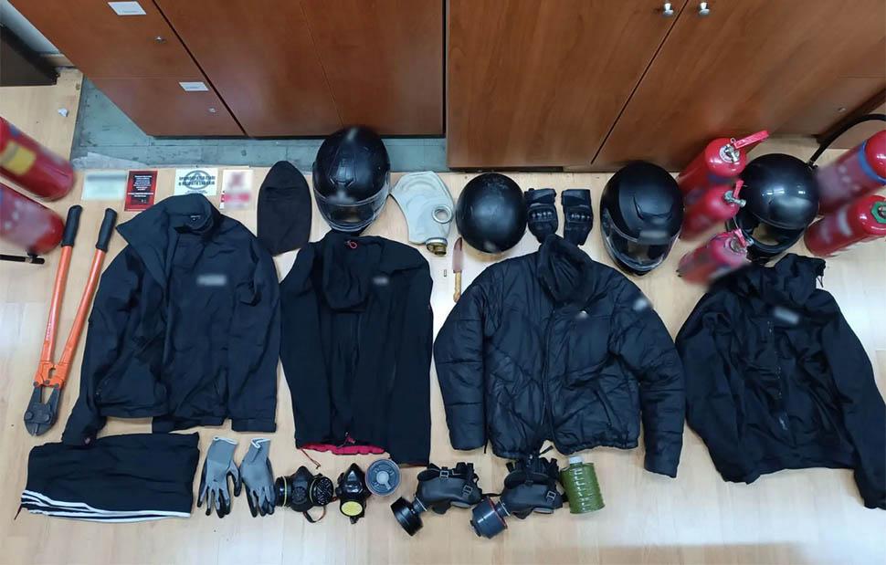 Ρουχισμός, πέντε αντιασφυξιογόνες μάσκες, τρικάκια – φέιγ βολάν, βιβλίο, αυτοκόλλητα και έντυπα αναρχικού περιεχομένου, 17 συσκευές κινητής τηλεφωνίας, πέντε μονάδες Η/Υ, τέσσερις φορητοί υπολογιστές και τέσσερα USB, δύο σκληροί δίσκοι και τρεις παιχνιδομηχανές, δύο τάμπλετ και τρεις κάρτες sim, μία φωτογραφική μηχανή με κάρτα μνήμης, τέσσερα κράνη μοτοσικλετιστή, έξι περιλαίμια και κουκούλα, τύπου full – face, ένας κάλυκας, ένα μαχαίρι και ένας μεταλλικός κόφτης, χειρόγραφες σημειώσεις και πλήθος φωτοαντιγράφων, πέντε ζευγάρια γάντα, μία τσάντα πολλαπλών χρήσεων, μέσα στην οποία υπήρχαν επικαλαμίδα, ζευγάρι γάντια, ζευγάρι γάντια εργασίας, γάντι, δερμάτινο κοκάλινο γάντι, πλαστικό γάντι, γυαλί κολυμβητηρίου, 12 δεματικά (tie rap) και επτά πυροσβεστήρες.