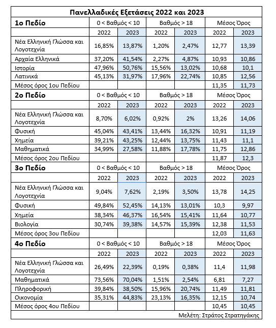 Περισσότερους κάτω από τη βάση είχαμε στα Αρχαία Ελληνικά και την Ιστορία και περισσότερους αριστούχους στα Αρχαία Ελληνικά, τα δύο μαθήματα που πεδίου που απαιτούν το περισσότερο διάβασμα. Ο μέσος όρος των δύο αυτών μαθημάτων ήταν χειρότερος το 2023, λόγω του μεγαλύτερου ποσοστού υποψηφίων που έγραψαν κάτω από τη βάση.