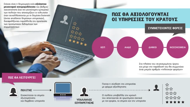 Για πρώτη φορά οι πολίτες θα μπορούν να αξιολογούν τις δημόσιες υπηρεσίες μέσω ενός συστήματος ηλεκτρονικής αξιολόγησης, «βαθμολογώντας» την ποιότητα των παρεχόμενων υπηρεσιών. Στόχος του ηλεκτρονικού μηχανισμού ανατροφοδότησης είναι μεταξύ άλλων η δημιουργία ενός «καναλιού» άμεσης, αμφίδρομης επικοινωνίας της δημόσιας διοίκησης με τους πολίτες, η άντληση επιπλέον δεδομένων, που θα συμβάλλει στην αντικειμενική αξιολόγηση των φορέων και των ομάδων του Δημοσίου που παρέχουν εξυπηρέτηση (front line), ο άμεσος εντοπισμός προβληματικών περιπτώσεων, ώστε να γίνουν άμεσες διορθωτικές ενέργειες, αλλά και η διαμόρφωση κουλτούρας συνεχούς βελτίωσης. Επιπλέον στόχευση είναι να γίνει το Δημόσιο πιο αποτελεσματικό, πιο αποδοτικό και τελικά πιο εξυπηρετικό για τους πολίτες.