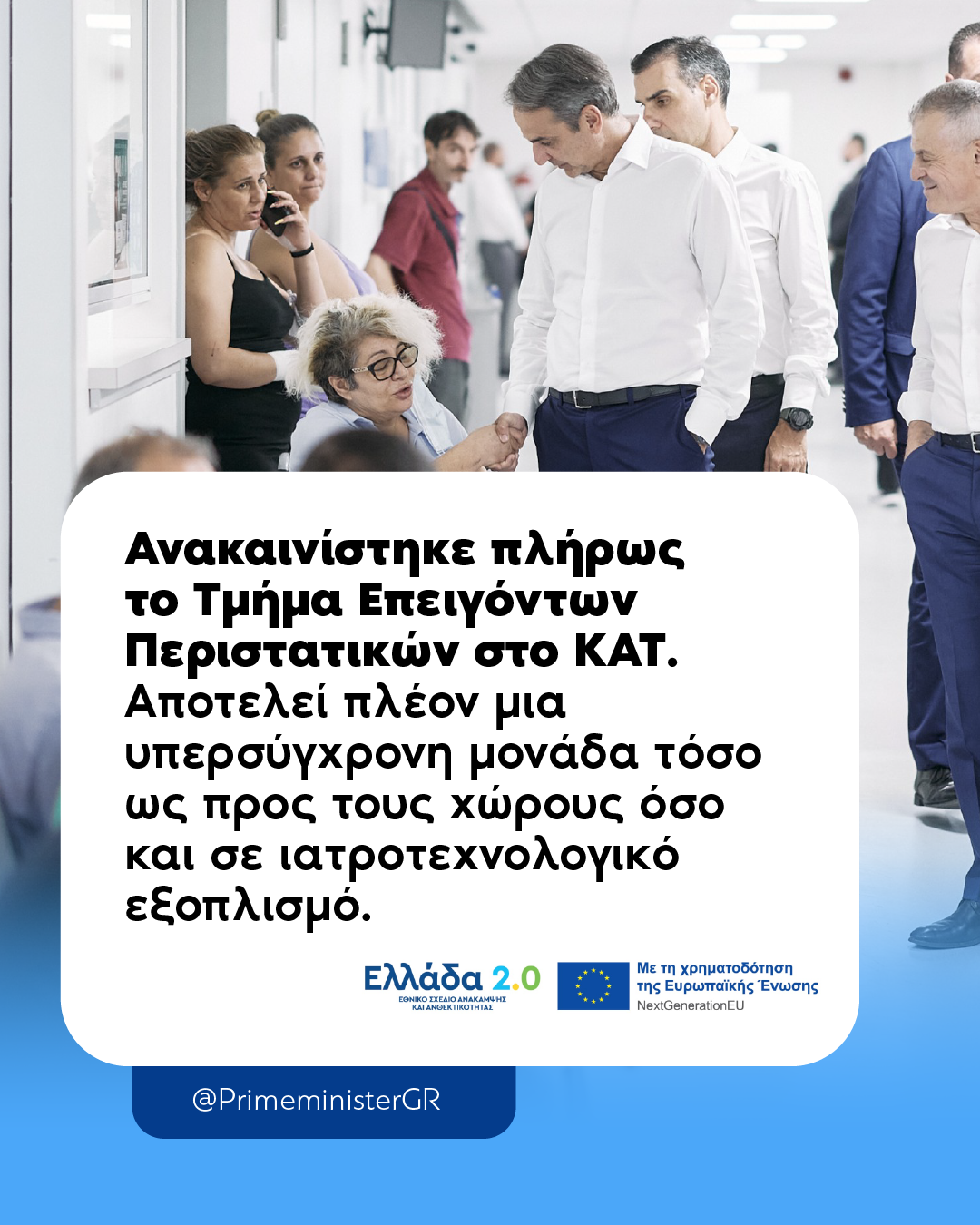 Είχα την ευκαιρία να επισκεφθώ την ολοκαίνουργια πτέρυγα του Τμήματος Επειγόντων Περιστατικών στο ΚΑΤ, το μεγαλύτερο ορθοπαιδικό νοσοκομείο και κέντρο τραύματος στην Ελλάδα. Μια ανακαίνιση που ήταν απαραίτητη, αφού μόνο στα Επείγοντα του νοσοκομείου φτάνουν πάνω από 87.000 πολίτες/ασθενείς ετησίως και 110.000 στα Εξωτερικά Ιατρεία. Πρόκειται για έναν εντυπωσιακό μετασχηματισμό του ΤΕΠ σε μια υπερσύγχρονη μονάδα, τόσο ως προς τους χώρους όσο και σε ιατροτεχνολογικό εξοπλισμό. Κάτι που σημαίνει αναβάθμιση της ικανότητάς του να διαχειρίζεται -με ταχύτητα και μεγαλύτερη αποτελεσματικότητα- επείγοντα περιστατικά κάθε βαρύτητας, σύμφωνα με τα πιο πρόσφατα διεθνή πρότυπα. Να θυμίσω ότι την προηγούμενη πενταετία ο προϋπολογισμός του ΚΑΤ αυξήθηκε κατά σχεδόν 70% φτάνοντας τα 66,3 εκ. ευρώ πέρυσι. Εντός των επόμενων μηνών αναμένεται να ολοκληρωθούν οι εργασίες ανακαίνισης και αναβάθμισης σε άλλα 16 ΤΕΠ στην Αττική. Συνολικά έχουν διατεθεί 142 εκ. ευρώ από το Ταμείο Ανάκαμψης για την κατασκευή, επέκταση, ανακαίνιση και εκσυγχρονισμό 63 ΤΕΠ σε όλη τη χώρα.