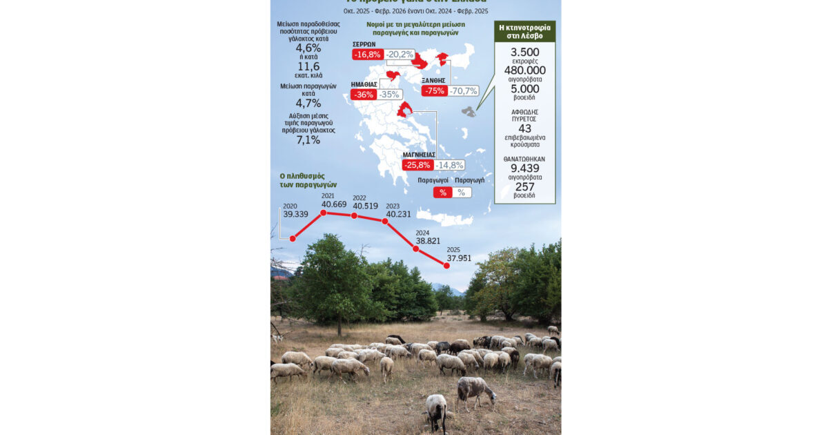 Μόνο μέσα στο πεντάμηνο Οκτωβρίου 2025 – Φεβρουαρίου 2026, περίοδο κατά την οποία παρατηρήθηκε έξαρση των κρουσμάτων της ευλογιάς, η συνολική παραδοθείσα ποσότητα πρόβειου γάλακτος ήταν λιγότερη κατά 11.500 τόνους ή κατά 4,6% σε σύγκριση με το πεντάμηνο Οκτωβρίου 2024 – Φεβρουαρίου 2025, περίοδο που η ευλογιά ήταν στους πρώτους μήνες εμφάνισής της στην ελληνική προβατοτροφία. Και μπορεί αυτή η μείωση κατά 4,6% να φαίνεται μικρή, όμως το πρόβλημα είναι πολλαπλάσιο σε συγκεκριμένες περιοχές. Αξίζει, δε, να σημειωθεί ότι στα στοιχεία δεν αποτυπώνεται ακόμη ο αντίκτυπος από τον αφθώδη πυρετό που πλήττει την κτηνοτροφία στη Λέσβο.