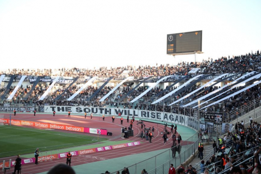 Το πέταλο των Κρητικών έχει «καλυφθεί» από ένα γιγαντιαίο πανό που αναγράφει «THE SOUTH WILL RISE AGAIN», ενώ τα δύο διαζώματα… ενώνονται με ασπρόμαυρες κορδέλες.