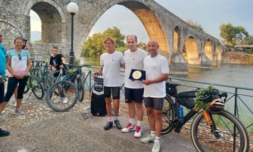 Μπροστά από τον επιβλητικό Ναό της Παρηγορήτισσας, τον υποδέχθηκε ο Δήμαρχος Αρταίων, Χριστόφορος Σιαφάκας, μέλη του Ποδηλατικού Ομίλου Άρτας, μέλη της Αρτινής Λέσχης Μοτοσυκλέτας και πολλοί συμπολίτες με το ποδήλατό τους.