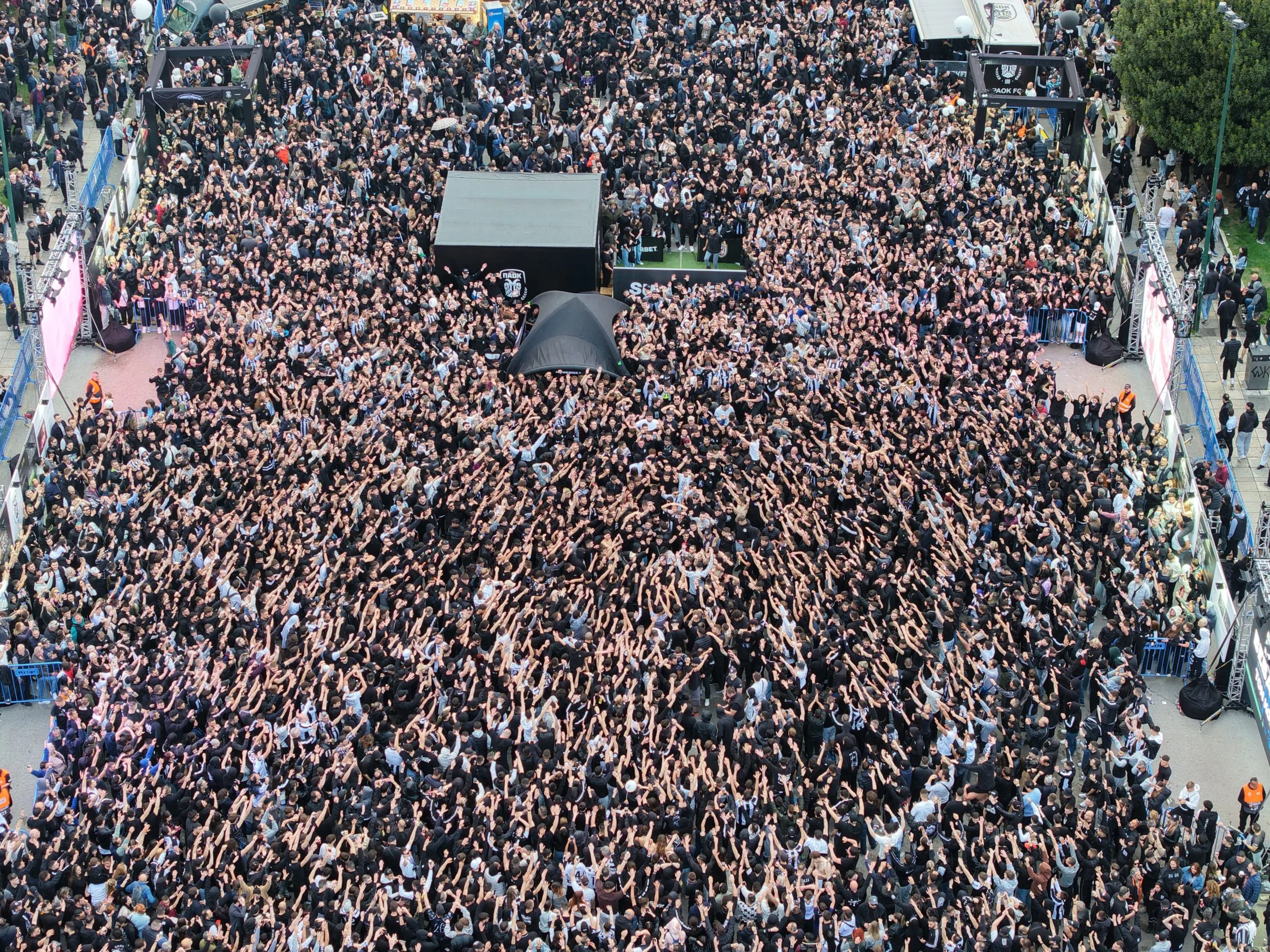 Χιλιάδες φίλοι του ΠΑΟΚ κατέκλυσαν την Πλατεία Αριστοτέλους για να γιορτάσουν τα 100 χρόνια από την ίδρυση του συλλόγου, δημιουργώντας από νωρίς ατμόσφαιρα… γηπέδου στο κέντρο της Θεσσαλονίκης. Οπαδοί κάθε ηλικίας, οικογένειες και φίλοι της ομάδας έδωσαν το «παρών» στη μεγάλη γιορτή.