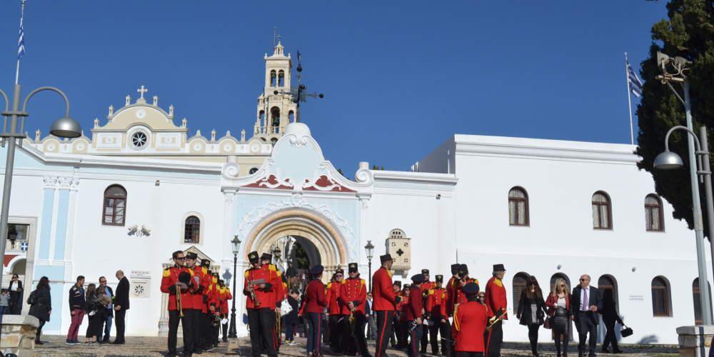 Σημαιοστόλιστος ο Ιερός Ναός της Ευαγγελίστριας υποδέχεται τους πιστούς από κάθε γωνιά της Ελλάδος και το εξωτερικό που έχουν φτάσει στην Τήνο ταπεινοί προσκυνητές στη χάρη της Παναγίας.