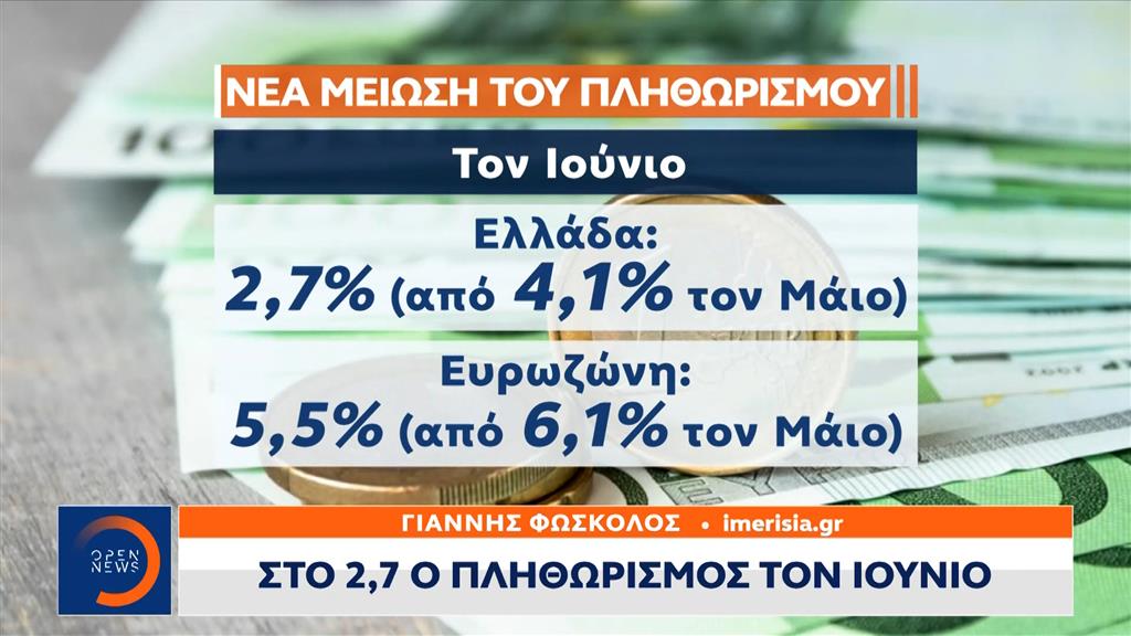 Νέα επιβράδυνση του πληθωρισμού στην Ελλάδα σημειώθηκε τον Ιούνιο, για ένατο συνεχόμενο μήνα, σύμφωνα με τα τελευταία στοιχεία της Eurostat. Ο ρυθμός αύξησης των τιμών στη χώρα μας υποχώρησε στο 2.7% από 4.1% τον προηγούμενο μήνα, σε αρκετά χαμηλότερο επίπεδο από τον μέσο όρο της ευρωζώνης που κυμαίνεται στο 5.5%, από 6.1% τον Μάιο. Σημειώνεται ότι ο πληθωρισμός στις ισχυρότερες οικονομίες της ευρωζώνης παραμένει σε υψηλά επίπεδα, με τη Γερμανία στο 6.8%, τη Γαλλία στο 5.3%, την Ιταλία στο 6.7% και την Ολλανδία στο 6.4%.