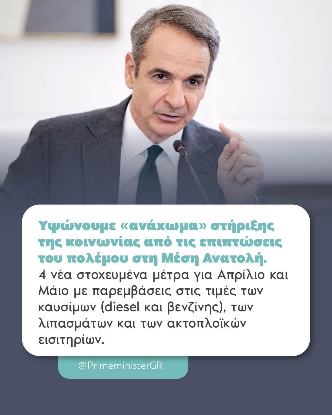 Προχωράμε, τώρα, σε μια νέα δέσμη τεσσάρων στοχευμένων μέτρων για τους μήνες Απρίλιο και Μάιο με παρεμβάσεις στις τιμές των καυσίμων (diesel και βενζίνης), των λιπασμάτων και των ακτοπλοϊκών εισιτηρίων. Τα μέτρα έχουν ήδη εξειδικευτεί και, με τα διευρυμένα εισοδηματικά κριτήρια, η στήριξη θα καλύπτει 3 στα 4 νοικοκυριά, με το όφελος να είναι μεγαλύτερο για τις οικογένειες με παιδιά. Καταβάλλεται προσπάθεια ώστε η πλατφόρμα για το Fuel Pass να ανοίξει εντός της ερχόμενης εβδομάδας και να δοθεί επιδότηση πριν τα μέσα του μηνός. Ειδικά για τους αγρότες μας, η επιδότηση στις τιμές των λιπασμάτων θα ισχύει αναδρομικά από τις 15 Μαρτίου. Το ύψος του προγράμματος φτάνει περίπου τα 300 εκ. ευρώ και, επειδή κανείς δεν ξέρει πόσο θα κρατήσει αυτός ο πόλεμος, προφανώς διατηρούμε εφεδρείες για την περίπτωση που η παγκόσμια οικονομική κατάσταση επιδεινωθεί σημαντικά. Το μήνυμά μας, συνεπώς, είναι ένα: η κυβέρνηση είναι και θα παραμείνει στο πλευρό κάθε Ελληνίδας και κάθε Έλληνα, όπως το έκανε σε κάθε δύσκολη στιγμή μέχρι τώρα.