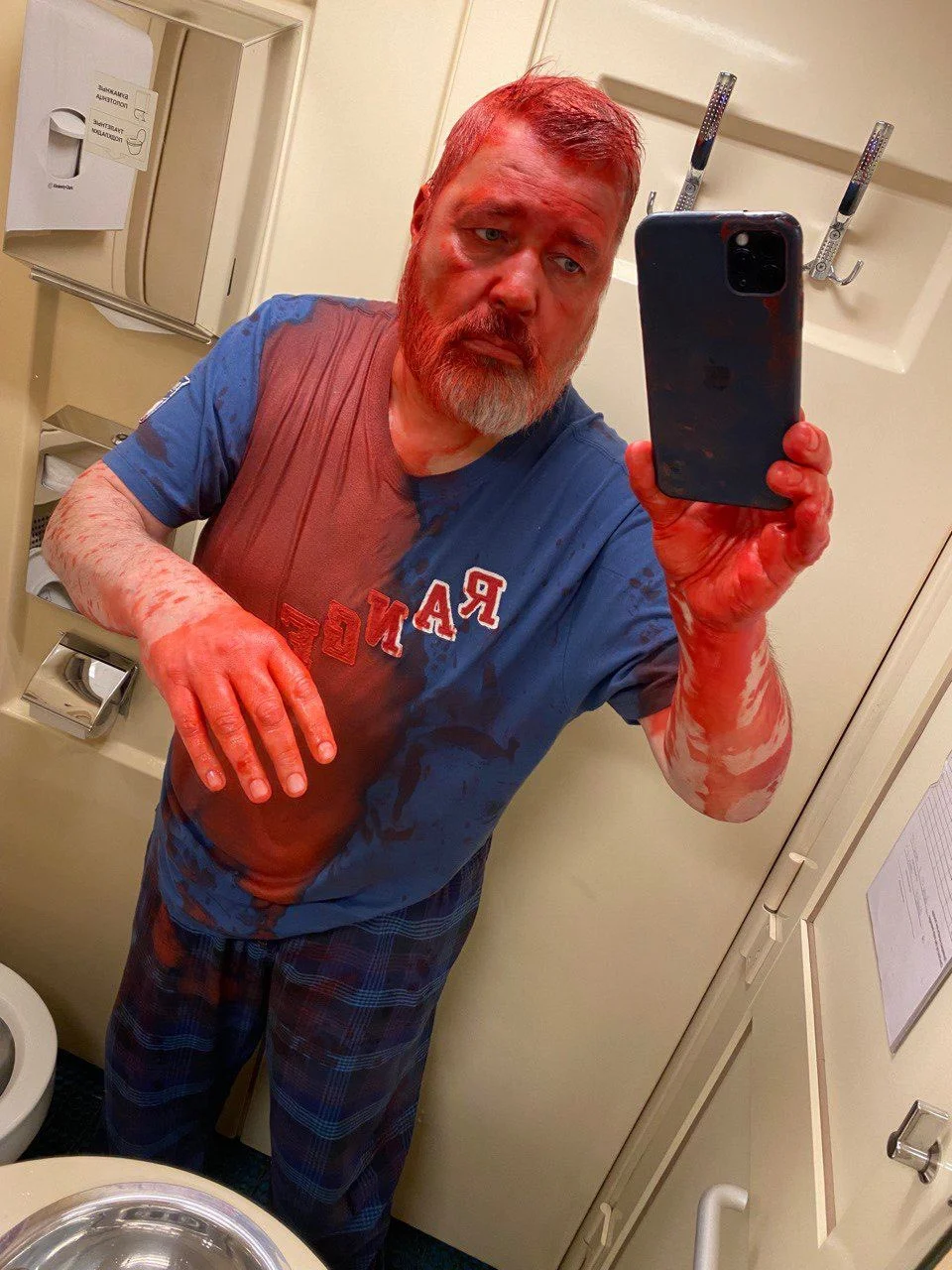 Η ανάρτηση έδειχνε φωτογραφίες του Μουράτοφ καλυμμένο με μπογιά και ένα βαγόνι τρένου βουτηγμένο σε κόκκινο υγρό.
