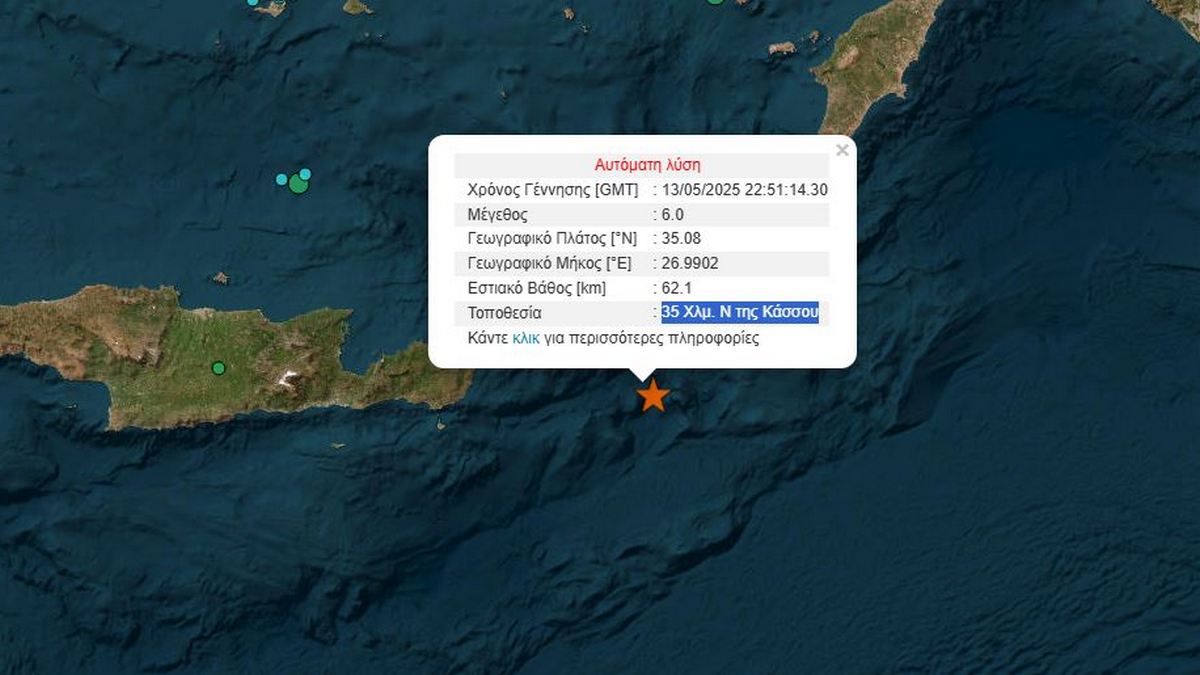Σύμφωνα με το Γεωδυναμικό Ινστιτούτο το επίκεντρο εντοπίστηκε 35 χιλιόμετρα νότια της Κάσου και το εστιακό βάθος υπολογίζεται στα 62,1 χιλιόμετρα. Ακολούθησε και μετασεισμός, 3,4 Ρίχτερ λίγο αργότερα.