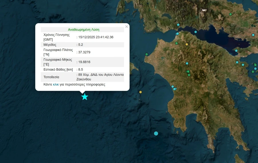 «Ισχυρή», χαρακτηρίστηκε η σεισμική δόνηση μεγέθους 5,2 βαθμών της κλίμακας Ρίχτερ, που σημειώθηκε στη 01:41 μετά τα μεσάνυχτα (Τρίτη 16/12), σε υποθαλάσσια περιοχή του Ιονίου Πελάγους, νοτιοδυτικά της Ζακύνθου.σύμφωνα με την μέτρηση του Γεωδυναμικού Ινστιτούτου του Αστεροσκοπείου Αθηνών,