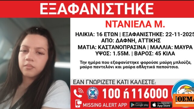 Συναγερμός έχει σημάνει για την εξαφάνιση της 16χρονης Ντανιέλας Μ. στις 22 Νοεμβρίου 2025 από τη Δάφνη Αττικής. Το Χαμόγελο του Παιδιού ενημερώθηκε και εξέδωσε Missing Alert .