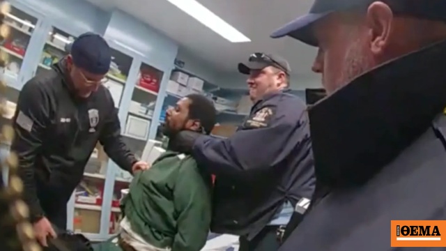 Ενώ ο κρατούμενος είναι καθιστός, με τα χέρια δεμένα, εμφανώς τραυματισμένος, φύλακας φορά πλαστικό γάντι, τον πιάνει από τον λαιμό και με τη βοήθεια συναδέλφου του τον στήνει στον τοίχο.