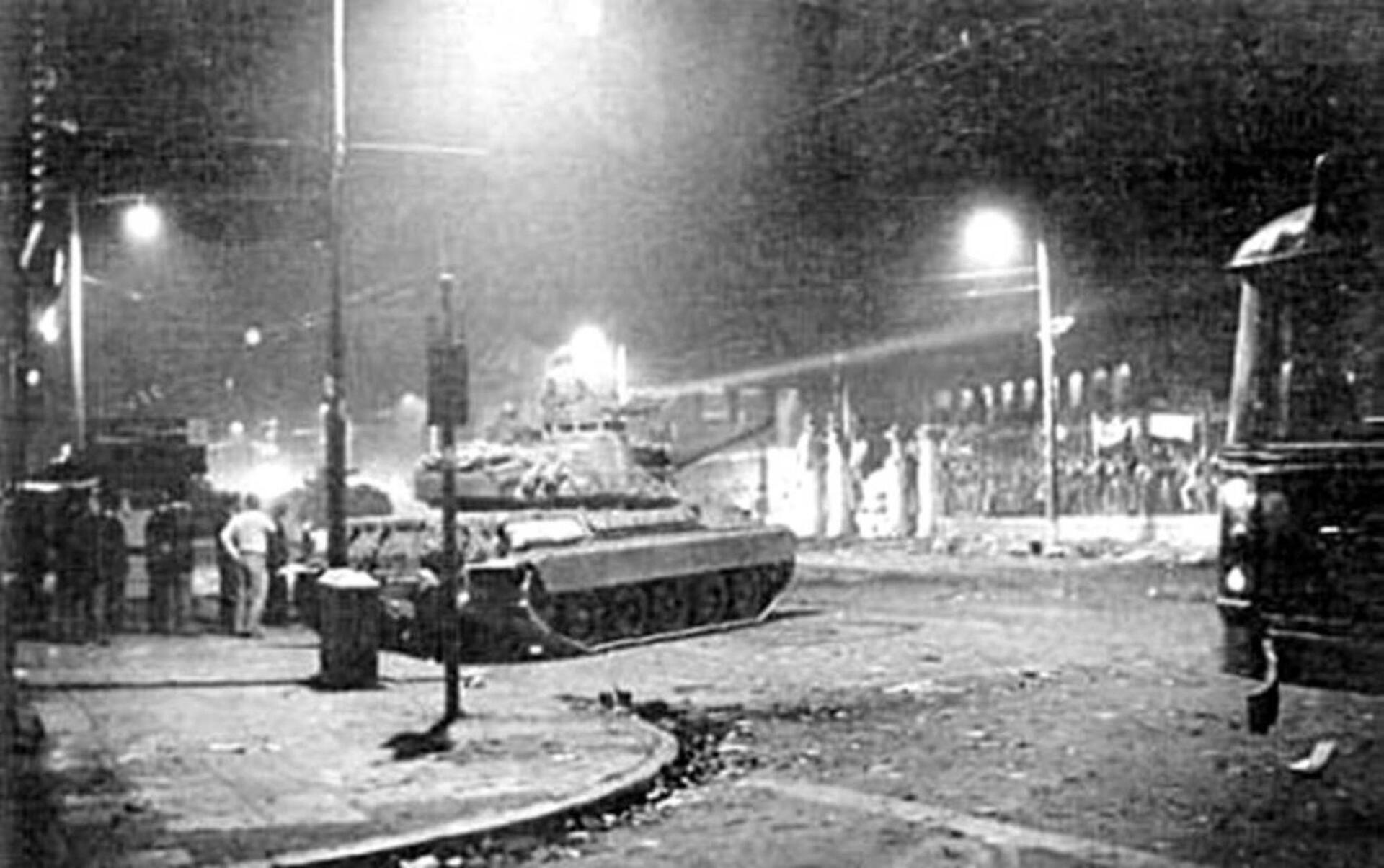 Η απριλιανή χούντα καταστέλλει την εξέγερση του Πολυτεχνείου με την εισβολή ενός τεθωρακισμένου άρματος από την κεντρική πύλη του ιδρύματος. (κεντρική φωτό)