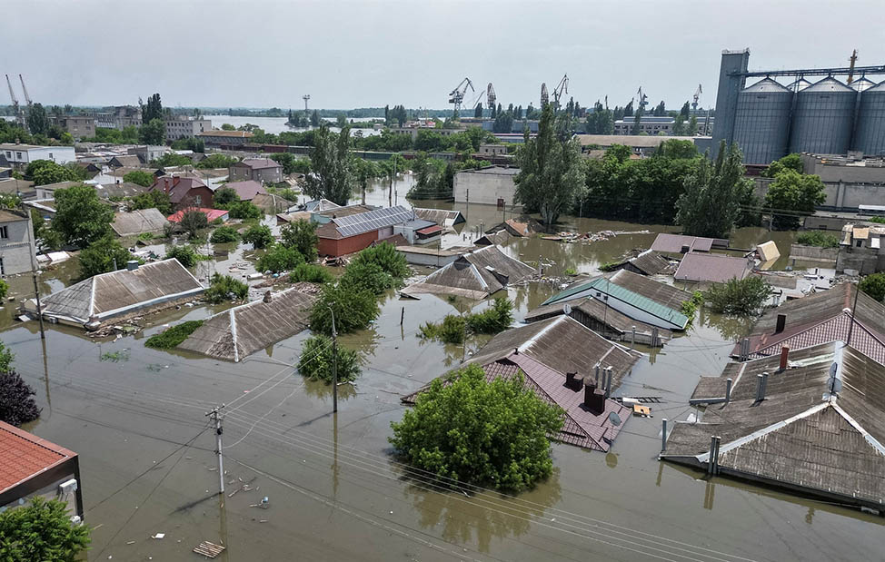 Μία ημέρα μετά τη μερική κατάρρευση του υδροηλεκτρικού φράγματος στην κατεχόμενη από τους Ρώσους περιοχή Νόβα Καχόβκα, στη νότια Ουκρανία, η στάθμη του νερού συνέχιζε να ανεβαίνει και στις δύο όχθες του Δνείπερου, προκαλώντας μεγάλης έκτασης καταστροφές. Τον γύρο του κόσμου κάνουν τα βίντεο τηλεοπτικών συνεργείων που απεικονίζουν σπίτια να έχουν παρασυρθεί από τα νερά του ποταμού και πολίτες να αγωνίζονται να σώσουν ό,τι μπορεί να σωθεί, με τα πυρά των εμπολέμων να ακούγονται από κοντινή απόσταση.