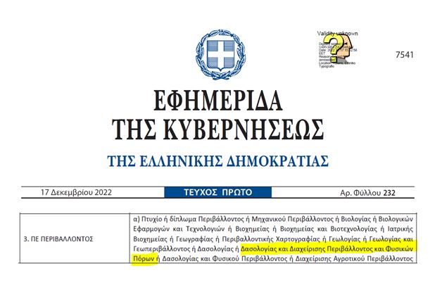 Ύστερα από συντονισμένες προσπάθειες των Προέδρων των Τμημάτων, Δασολογίας και Διαχείρισης Περιβάλλοντος και Φυσικών Πόρων του ΔΠΘ και Δασολογίας και Φυσικού Περιβάλλοντος του ΑΠΘ και του ΓΕΩΤΕΕ, οι απόφοιτοι των δύο Τμημάτων έχουν τη δυνατότητα να διορισθούν σε θέσεις του δημοσίου με ειδικότητα ΠΕ Περιβάλλοντος (ΦΕΚ 232/17-12-2022 τ. Α’).