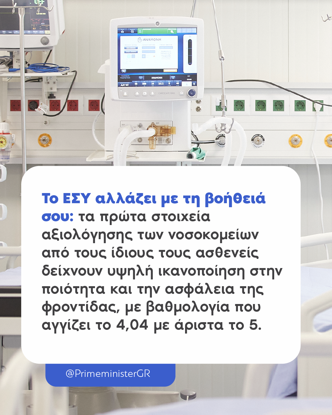 Έχουμε, επίσης, τα αποτελέσματα της αξιολόγησης της Εμπειρίας του Ασθενή στα Νοσοκομεία του ΕΣΥ με βάση τις απαντήσεις που συλλέχθηκαν από 14.8885 ερωτηματολόγια κατά το χρονικό διάστημα από 14 Ιουλίου 2025 έως 3 Οκτωβρίου 2025. Τα πρώτα στοιχεία δείχνουν πολύ υψηλή ικανοποίηση στους άξονες που αφορούν την ποιότητα και την ασφάλεια της φροντίδας, ενώ οι γεωγραφικές διαφορές είναι περιορισμένες. Στην αξιολόγηση συμμετέχουν 111 νοσοκομεία και 631 κλινικές. Τα στοιχεία είναι ενθαρρυντικά: συνολική βαθμολογία 4,04/5, πολύ υψηλή ικανοποίηση για την ποιότητα και την ασφάλεια της φροντίδας, θετικές αξιολογήσεις για τον εξοπλισμό, την επάρκεια προσωπικού και την εμπιστοσύνη προς γιατρούς και νοσηλευτές. Φυσικά, δεν εφησυχάζουμε. Η καθαριότητα, η στελέχωση και η συμμετοχή των ασθενών στις αποφάσεις είναι τομείς που χρειάζονται βελτίωση και εκεί θα εστιάσουμε. Η φωνή των ασθενών γίνεται πλέον εργαλείο πολιτικής. Για ένα ΕΣΥ πιο σύγχρονο, πιο αποτελεσματικό και πιο κοντά στον πολίτη.