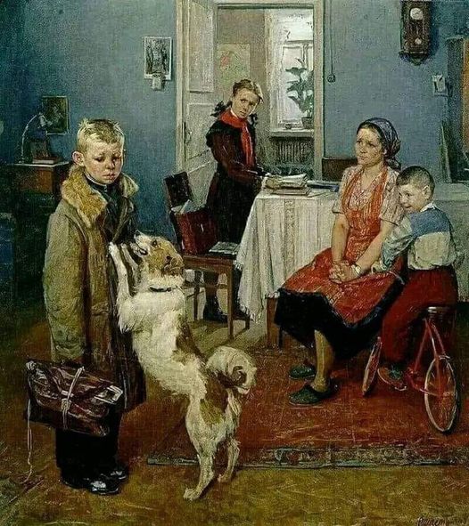 Fyodor Reshetnikov (1952): Αυτός ο πίνακας εχει τίτλο ” Χαμηλοί βαθμοί ξανά” και απεικονίζει τη στιγμή που ένα αγόρι επιστρέφει στο σπίτι από το σχολείο έχοντας γράψει άσχημα σε διαγώνισμα.