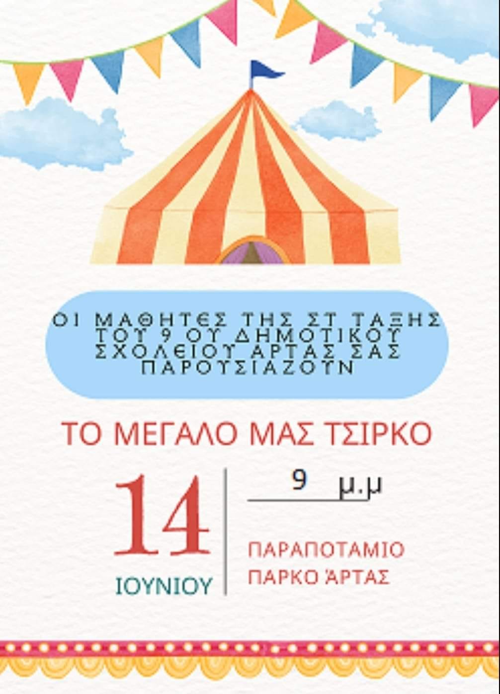 Το 9ο Δημοτικό Σχολείο Άρτας Θα κλείσει αυτή τη σχολική χρονιά με την παράσταση “Το μεγάλο μας Τσίρκο” την Παρασκευή 14/6 στο νέο θέατρο της πόλης 12/06/2024 prokirixi1