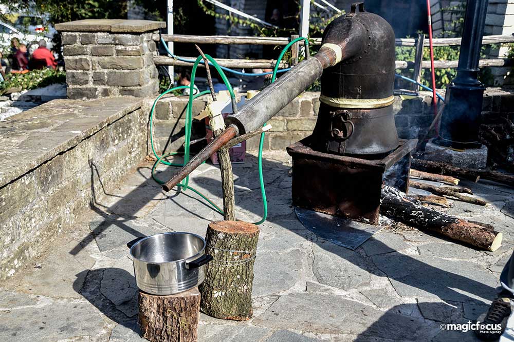Ειδικότερα στα ζαμπελοχώρια της ημιορεινής και ορεινής Άρτας (Ράμια, Λεπιανά, Γραικικό κλπ) αυτές τις μέρες έχουν πάρει “φωτιά” τα καζάνια από τα οποία παράγεται “το απόσταγμα της χαράς”. Η παρασκευή του απαιτεί λίγα μηχανήματα που πολλές φορές είναι πατέντες.
