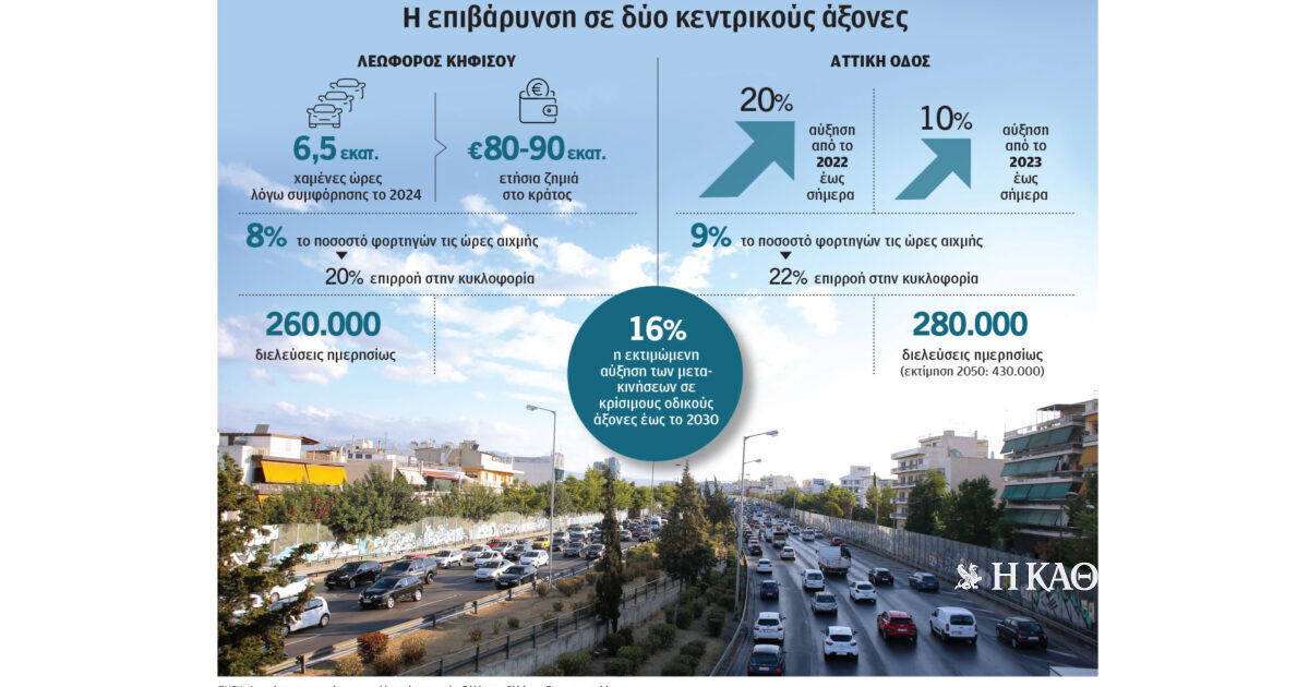 Σύμφωνα με στοιχεία του Συλλόγου Ελλήνων Συγκοινωνιολόγων, στη Λεωφόρο Κηφισού οι διελεύσεις ημερησίως ξεπερνούν τις 260.000. Αυξημένες κατά 20% είναι και οι διελεύσεις στην Αττική Οδό από το 2022 έως σήμερα, με αυτές να ανέρχονται ημερησίως περίπου στις 280.000, ενώ δυσοίωνες είναι και οι προβλέψεις για τον κυκλοφοριακό φόρτο στο συγκεκριμένο οδικό δίκτυο τα επόμενα χρόνια. Εκτιμάται πως οι διελεύσεις θα αυξηθούν περίπου 55% έως το 2050.