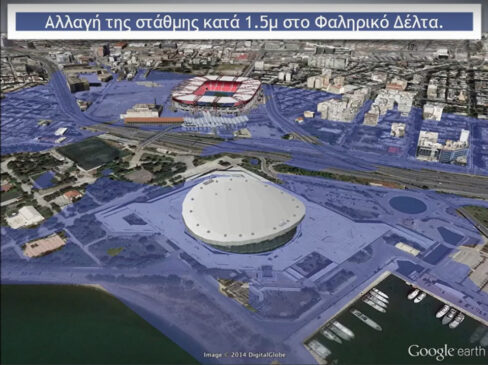 Στη συγκλονιστική προσομοίωση εικόνας από το Δέλτα Φαλήρου, που παρουσιάσε ο καθηγητής Κώστας Συνολάκης, Τακτικό μέλος της Ακαδημίας Αθηνών, Πρόεδρος της Επιστημονικής Επιτροπής για την Αντιμετώπιση της Κλιματικής Αλλαγής στην Ελλάδα, κατά τη διάρκεια του συνεδρίου «κλιματική αλλαγή και επιχειρηματικότητα», το στάδιο «Ειρήνης και Φιλίας», το στάδιο «Καραϊσκάκη», καθώς και ένα μεγάλο μέρος του Μοσχάτου, στο μέλλον, πιθανώς να βυθιστούν κάτω από τη θάλασσα.