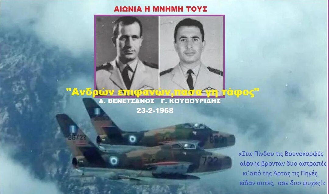 Κάθε χρόνο σαν σήμερα, ψηλά σε μια βουνοκορφή της Πίνδου, δυο μαύρες σκιές που μοιάζουν με διπλωμένα φτερά αετών πετούν πάνω από το χιονισμένο Κοκκινόλακο . Το τσακισμένο φτερούγισμά τους μας φέρνει στη μνήμη μας δυο αεροπόρους μας που πριν από πενήντα τρία χρόνια, συνάντησαν εκεί τη μοίρα τους και έγιναν αθάνατοι.
