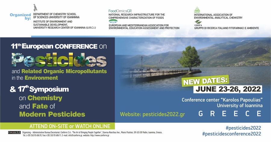 Το «11ο Ευρωπαϊκό Συνέδριο με θέμα τα Φυτοφάρμακα και τους συναφείς οργανικούς μικρορύπους στο περιβάλλον» (11th European Conferenceon Pesticides and Related Organic Micropollutants in the Environment) πραγματοποιείται από 23 έως 26 Ιουνίου 2022 στο Συνεδριακό Κέντρο του Πανεπιστημίου Ιωαννίνων «Κάρολος Παπούλιας» και διοργανώνεται από το Τμήμα Χημείας του Πανεπιστημίου Ιωαννίνων σε συνεργασία με τοΙνστιτούτο Περιβάλλοντος και Αειφόρου Ανάπτυξης (Ι.Π.Α.Α.) του Πανεπιστημιακού Ερευνητικού Κέντρου Ιωαννίνων, την ΙnternationalAssociation of Environmental Analytical Chemistry (IAEAC), την European-Mediterranean Association for Environmental Education Assessment and Protection (ENEAP), την Gruppo di Ricerca Italiano Fitofarmaci e Ambiente (GRIFA)…